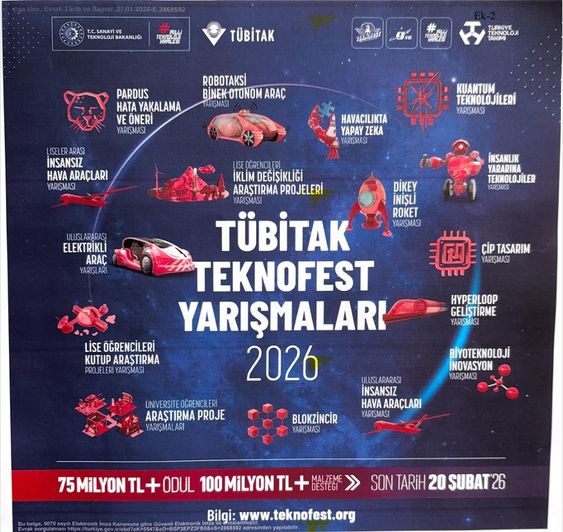 Üniversitemizin akademik personeli ve öğrencilerinin bilim, teknoloji ve yenilik alanlarındaki çalışmalarını teşvik etmek; millî teknoloji hamlesine katkı sunmalarını desteklemek amacıyla düzenlenen Havacılık, Uzay ve Teknoloji Festivali TEKNOFEST kapsamındaki yarışmalara katılımlarının artırılması büyük önem taşımaktadır. Bu kapsamda, farklı disiplinlerde düzenlenen TEKNOFEST yarışmaları; öğrencilerimizin ve akademik personelimizin bilgi ve becerilerini uygulamaya dönüştürmelerine, takım çalışması deneyimi kazanmalarına ve yenilikçi projeler geliştirmelerine önemli katkılar sağlamaktadır. Akademik personelimizin ve öğrencilerimizin yarışmalara katılım göstermeleri, üniversitemizin bilimsel ve teknolojik görünürlüğünü artırmasının yanı sıra, ulusal ve uluslararası platformlarda temsil gücünü de güçlendirecektir. Bu doğrultuda, detaylı bilgilere TEKNOFEST'in resmi sitesi üzerinden (www.teknofest.org) ulaşabilmekte olup başvurular 20 Şubat 2026 tarihine kadar devam etmektedir.
